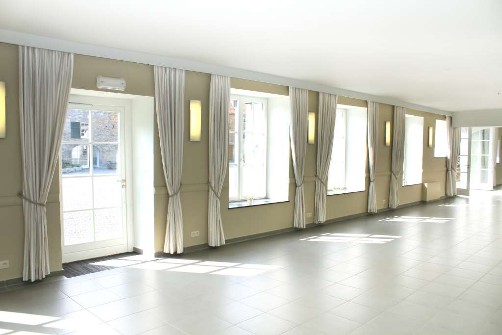 L’Écurie fait le lien entre le Château et le Fenil. L’espace est très lumineux et est de plain pieds avec la Cour. Un long bar blanc, les lieux se prêtent bien pour une soirée, une exposition,….